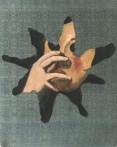 In quest’opera la superficie decorata si apre come una ferita o una soglia, lasciando emergere un volto e una mano.