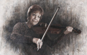Oil on Canvas This is a portrait of the artist’s mother, Trish Corben. Trish grew up playing the violin, and