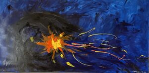 REL-ICTUS SCHIO,2023,acrilico su tela 140x70x2cm Il Big-Bang apre un universo che in principio arriva prepotente sotto forma di abisso oscuro