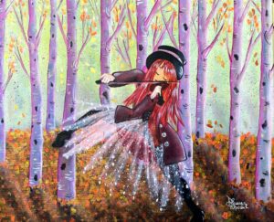 In una foresta di betulle dalle sfumature violacee e dorate, una giovane figura dai lunghi capelli rossi suona il violino