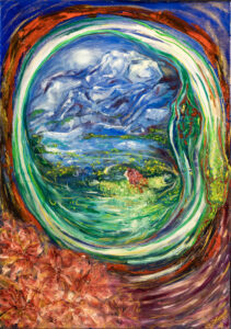 Scritto sul retro del dipinto direttamente dall’artista su ispirazione L’OMNIA, IL TUTTO, IL CERCHIO DELLA VITA:VISIONE ONIRICA. Alla ricerca del
