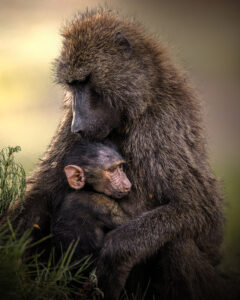 A baboon mother holds her baby tightly in her arms, while the little one, reassured by her presence, rests its