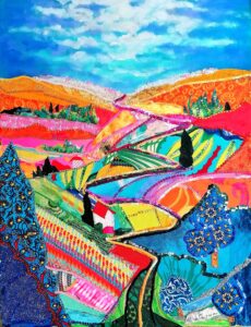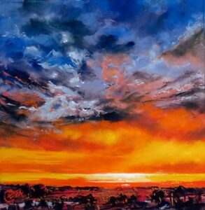 “Il cielo esplode in un turbine di fuoco e colore: un orizzonte che arde di luce e meraviglia.” Tecnica: Pastelli
