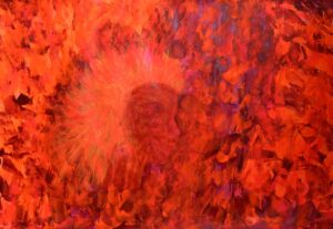 “Inner Pulse” is a soulful abstraction that captures a quiet explosion of inner awakening. The textured core, dark and mysterious,