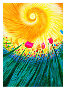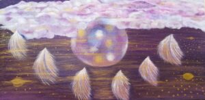 L’opera rappresenta il nuovo mondo dell’età dell’oro verso cui stiamo andando con una nuova energia e leggerezza mostrata dalle piume