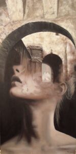 Volto femminile racchiuso in struttura architettonica che lascia intravvedere punti di fuga verso la luce