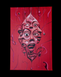 Questa opera nasce come una ferita moltiplicata. Un volto che non è uno, ma molti: frammenti di identità schiacciate, occhi