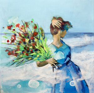 L’opera raffigura una figura femminile in riva al mare, avvolta in un abito azzurro che si fonde con il cielo