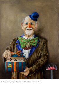 Un clown strizza L’ occhio cercando di divertire il pubblico con i capelli rossi, il buffo cappello il trucco sul