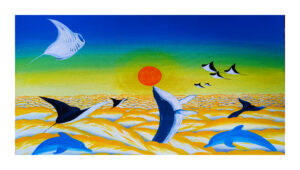 In this surrealist composition, the boundaries between the deep sea and the open sky dissolve. Majestically gliding through a golden