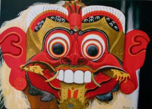 “Un volto-guardiano emerge con intensità: rosso vivo, oro caldo e linee decise. Lo sguardo rotondo e diretto cattura subito, come
