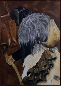Il quadro rappresenta l’unione di più figure tradizionali sarde: il Mamuthones, guardiano dei buoi, e su Boe, il bue. Il