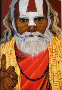 “Uno sguardo antico, una benedizione silenziosa: spiritualità e calore in colori accesi.”