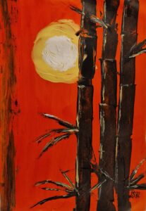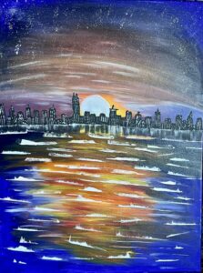It is a painting of a sunset over the city, with a large pale sun behind dark skyscrapers and colorful