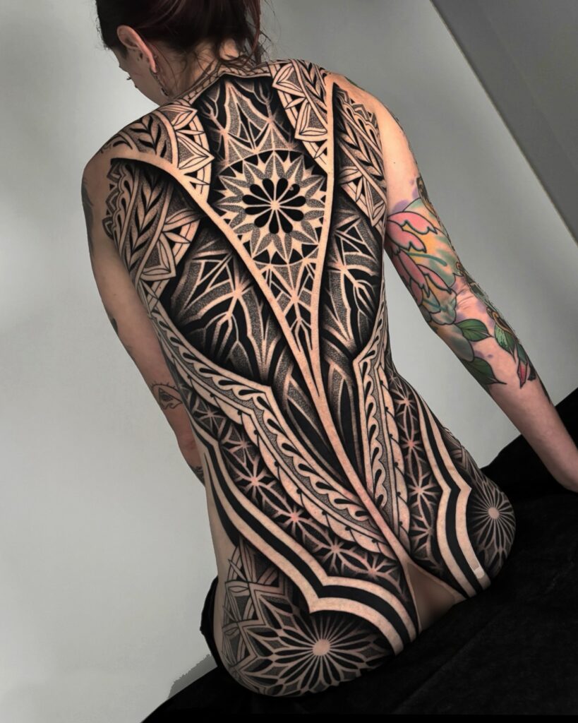 Tattoo work done in 6 sessions, roughly 45 hours in total.