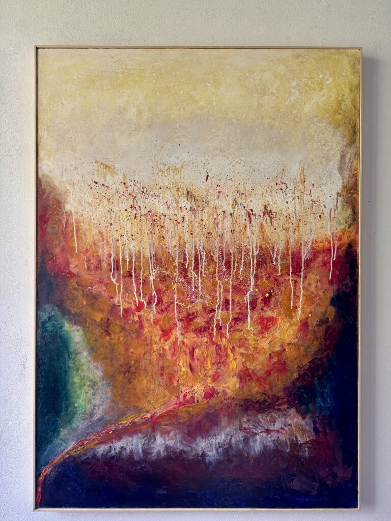 It explores presence and absence through a vibrant use of colors and shades. Vertical tones of purple, red, green, yellow, gold, and silver blend to…