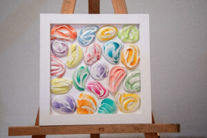 Fluid Art Acrylic on canvas, 40 × 40 cm, coated with resin. The painting is monochromatic, featuring shades of aqua