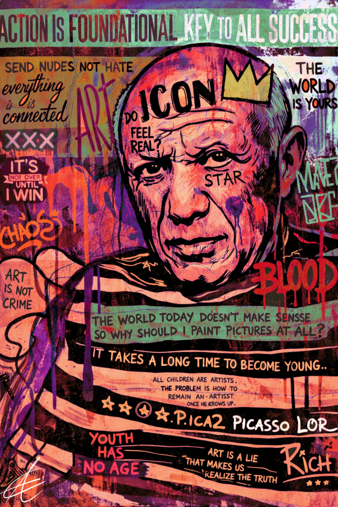 This digital artwork is a vibrant, graffiti-inspired portrait that appears to depict the famous painter Pablo Picasso. The composition blends street art, pop art, and…