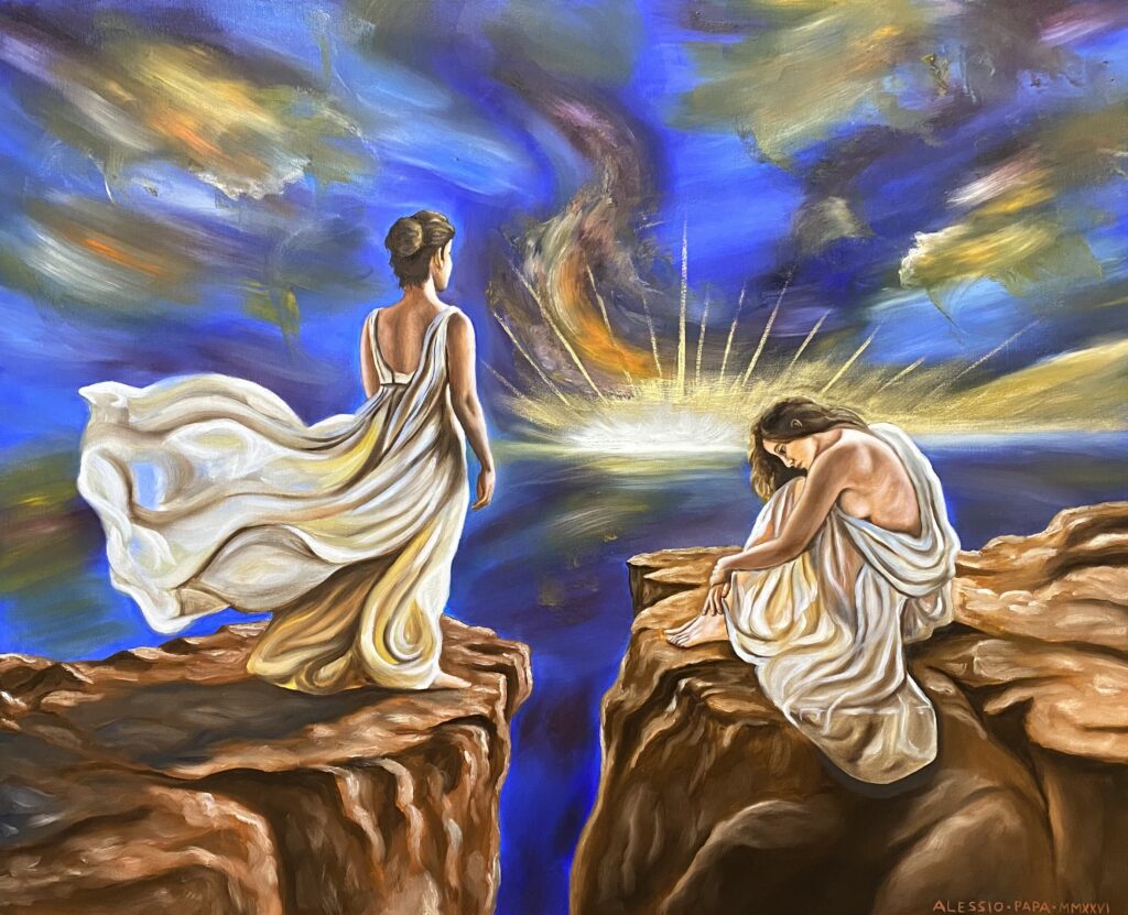 “Horizon” è un dipinto che vuole essere un augurio. Guardiamo oltre, alziamoci in piedi, guardiamo verso la linea immaginaria dell’orizzonte dove riponiamo sogni, ricordi, ma…