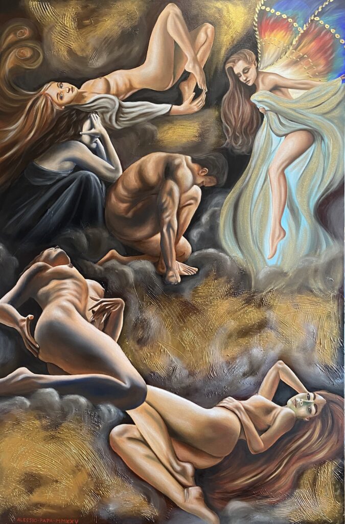 L’opera ispirata a Caronte è una metafora della vita. L’ho voluta strutturare a forma piramidale, come un triangolo (che simboleggia il cielo, l’aspirazione al divino)…