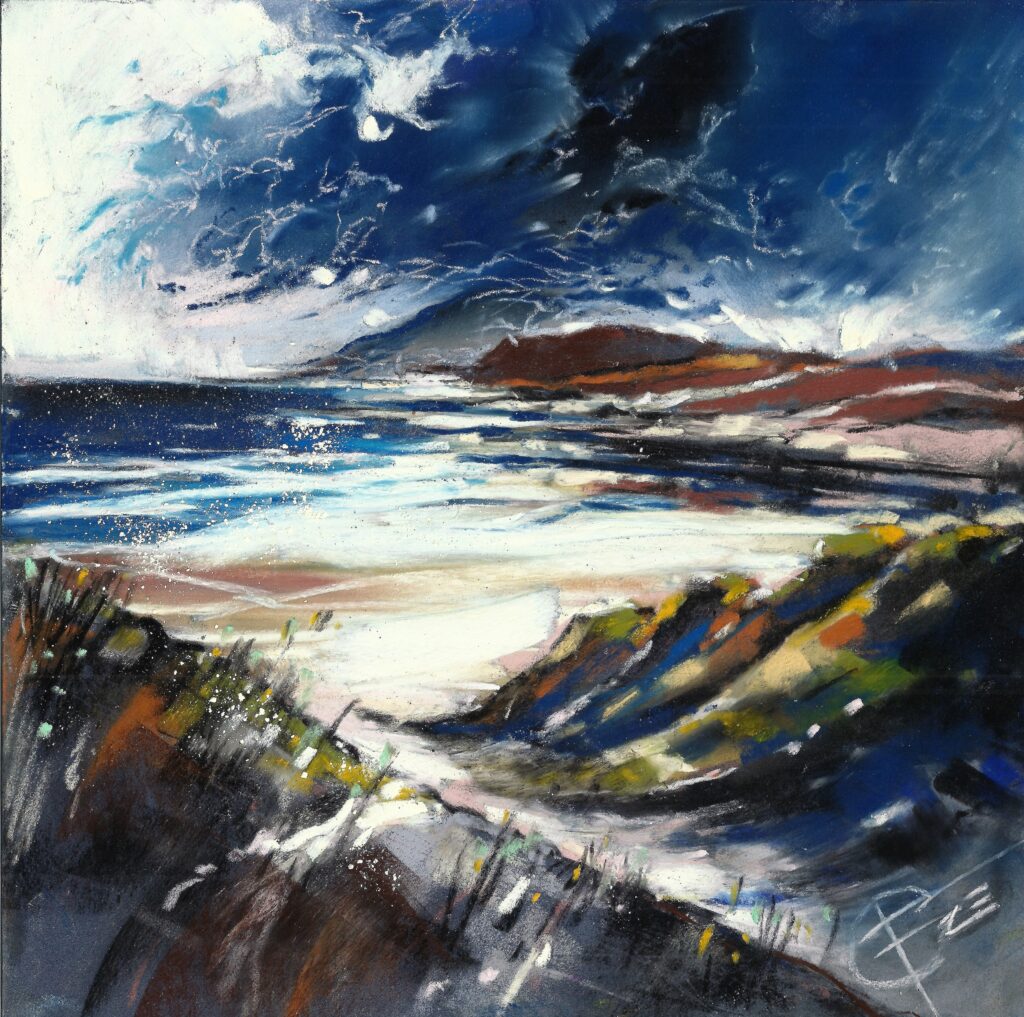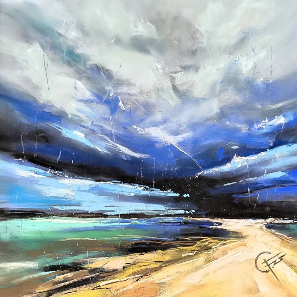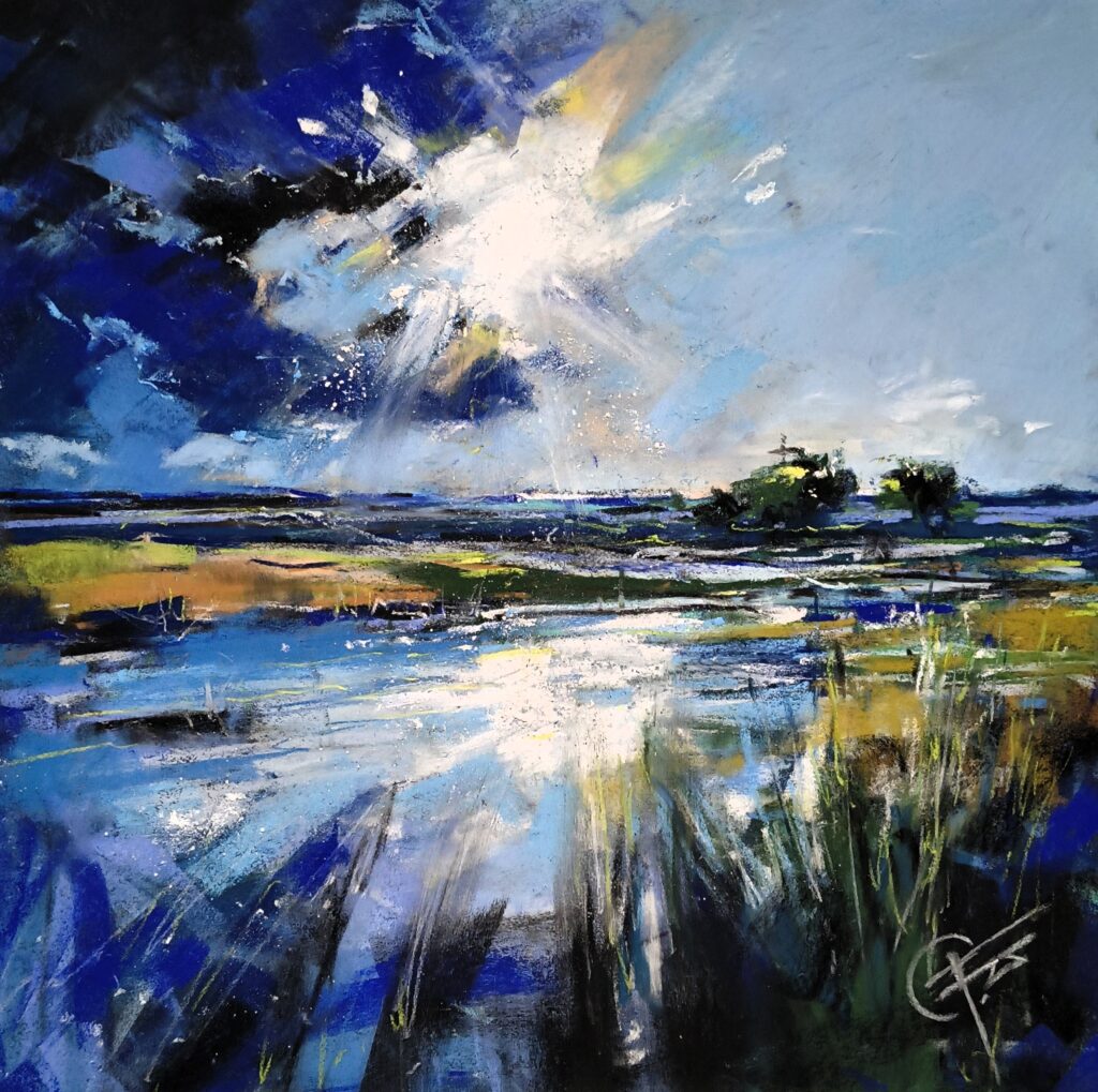 “Un improvviso bagliore squarcia la tempesta, spargendo speranza sulla terra selvaggia e aperta.” Tecnica: Pastelli morbidi su carta Canson Velvet, 30×30 cm Questo paesaggio evocativo…