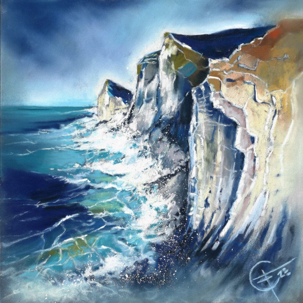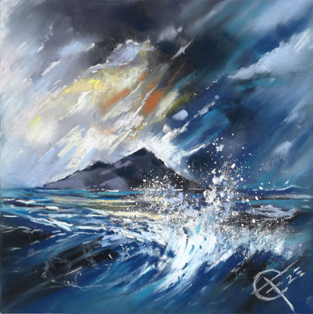 “Il mare si agita, il cielo si accende: emozioni e natura si fondono in un riflesso mutevole, specchio di un’anima inquieta.” Tecnica: Pastelli morbidi su…