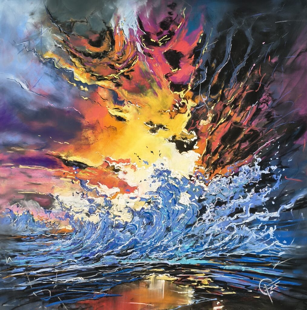 Non è solo disordine, è l’energia pura che si libera quando gli elementi smettono di obbedire alle regole. In quest’opera, il pastello cattura l’istante esatto in cui il fuoco del cielo e il tumulto dell’acqua collidono, trasformando il caos in una nuova, vibrante forma di bellezza irreversibile.