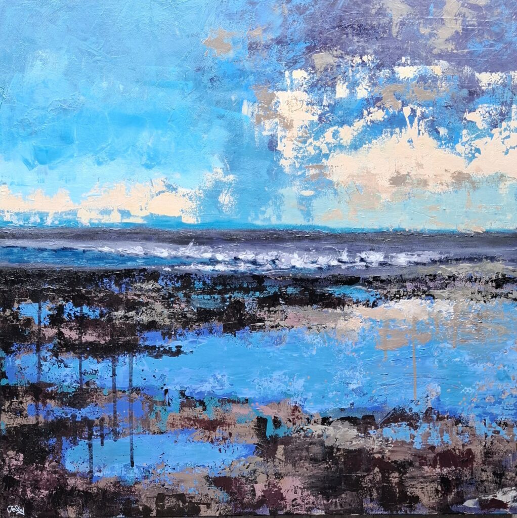 Soffermandoci ancora più attentamente la tecnica a spatola, così irregolare e materica, trasmette dinamismo. Non c’è nulla di statico: sembra di percepire il vento che sposta le nuvole e l’acqua che si ritira per creare una nuova onda.
