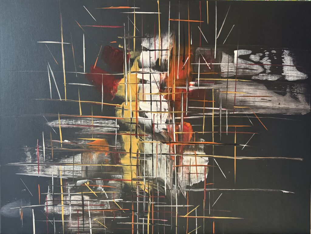 Un dipinto astratto dominato da un fondo scuro, attraversato da una fitta rete di linee sottili orizzontali e verticali. Macchie e striature di bianco, giallo,…