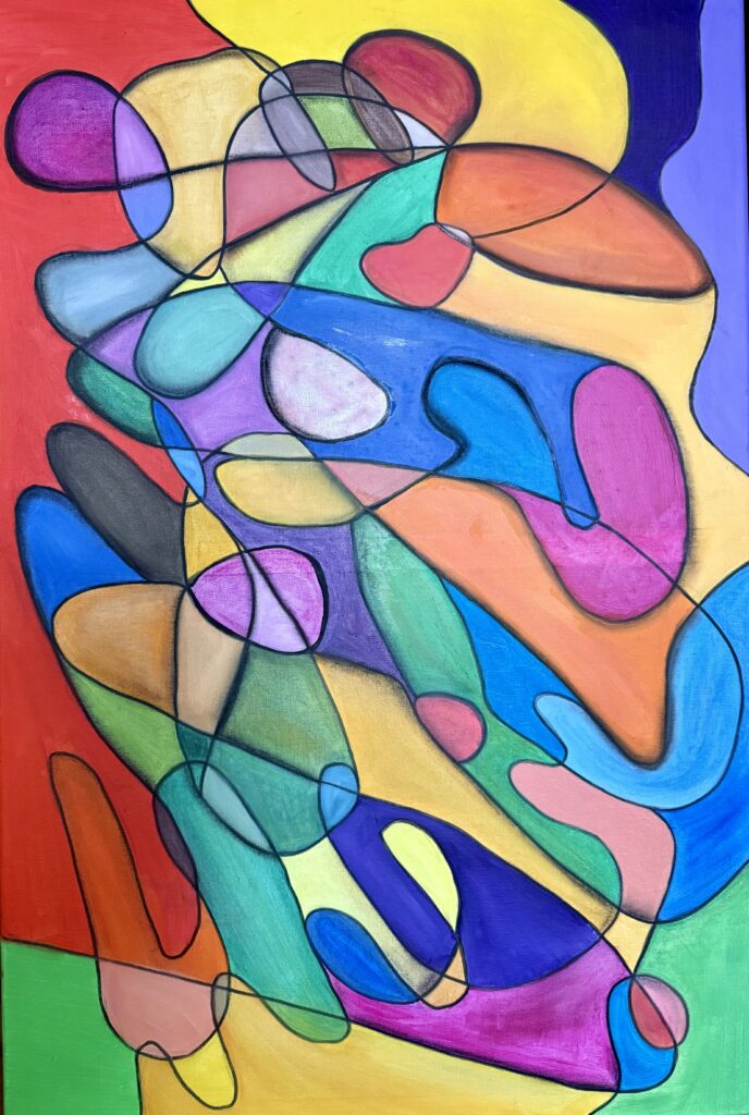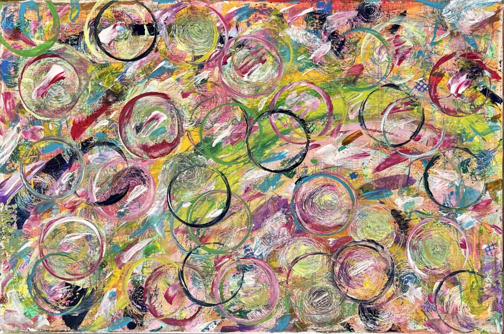 Un dipinto astratto vivace, ricco di colori brillanti e pennellate energiche, dominato da numerosi cerchi sovrapposti in varie tonalità. L’insieme crea un effetto dinamico e…