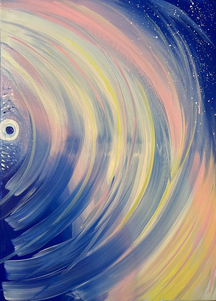 Il dipinto presenta ampie pennellate curve che si irradiano da sinistra verso destra, creando un forte senso di movimento circolare. I colori sono morbidi e…