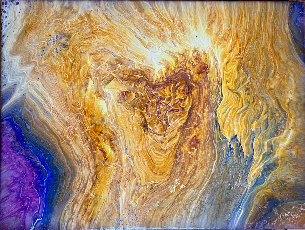 Un dipinto astratto nei toni caldi dell’oro e del rosso, attraversato da linee ondulate e texture circolari che creano un senso di movimento fluido. Piccoli…