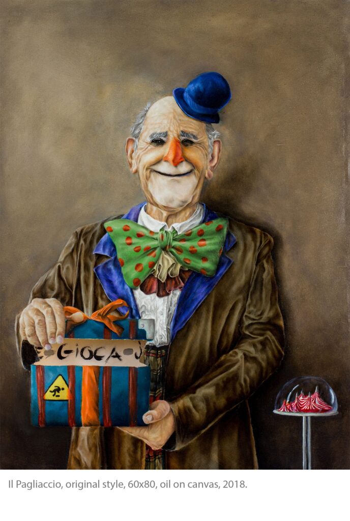 Un vecchio Clown porge allo spettatore un pacco regalo dove al suo interno é presente la scritta gioca. Sul lato in basso della figura é…