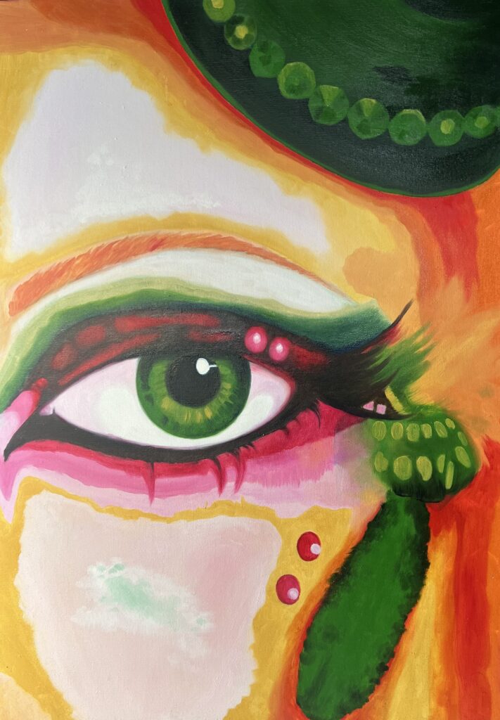 Emerald Uno sguardo verde, vivo come smeraldo, affiora da un incendio di arancio e oro. Tra gemme rosate e tracce di metamorfosi, la pelle diventa maschera:…