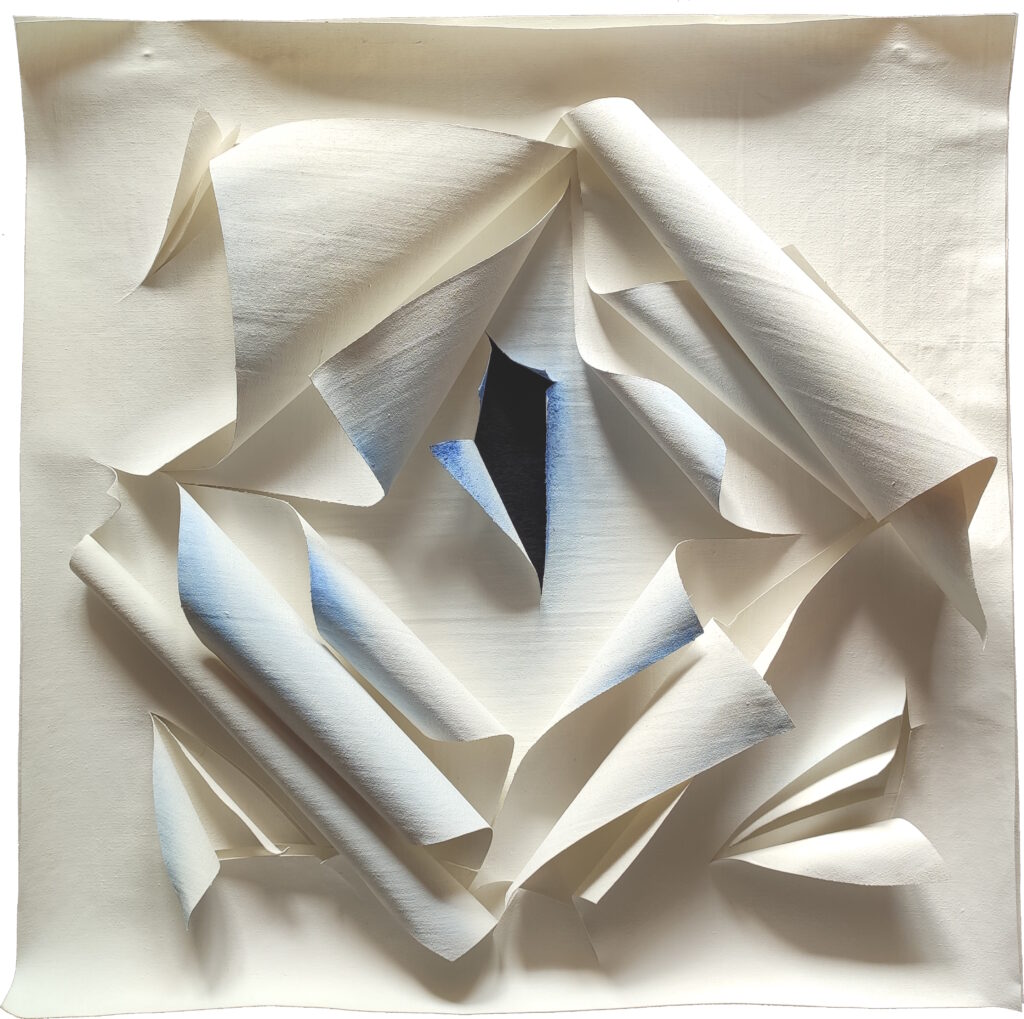 Lo spazio si fa sempre più fluido e leggero, i confini meno definiti, le dimensioni aumentano e si sovrappongono e/o si intersecano creando tunnel spazio-temporali (… ) Esplorano altre possibilità che va oltre la linearità del tempo in uno spazio quantico.