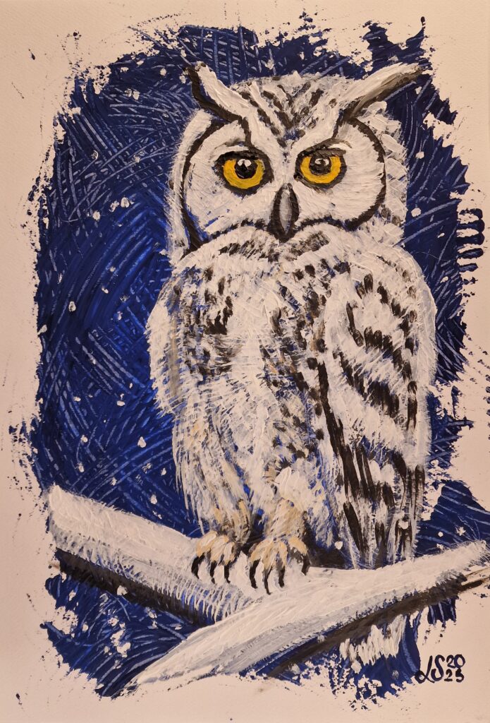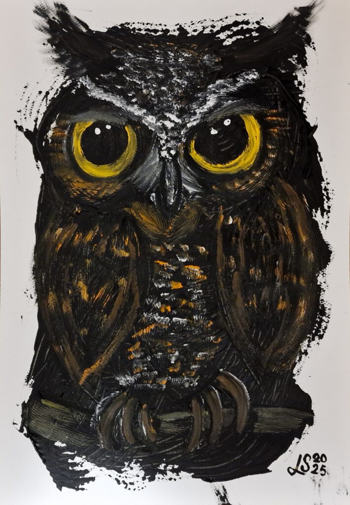 Il gufo nero, scruta con sguardo intenso e vigile. Simbolo di saggezza.