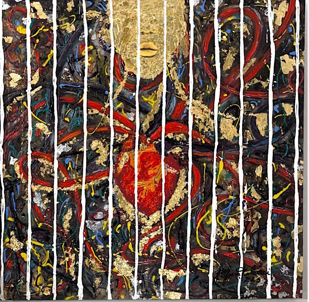 (50×60 su tela acrilico ) Raffigura un volto femminile delicato con labbra Carnose rosso intenso, simbolo di passione. Un occhio bianco e luminoso aggiunge mistero…