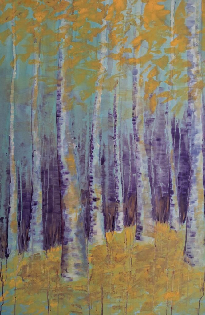 Il quadro fa parte della serie “Into the woods” che racchiude opere legate alla rinterpretazione del bosco, come luogo di espressione e trasformazione interiore. Ogni bosco è un bosco intimo e interiore che si trasfigura sulla tela come un pezzo di me.