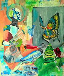 Opera realizzata con tecnica mista, colore acrilico e pastelli ad olio su tela con fondo materico. Misure 70×70 cm