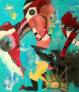 In this artwork, the cheese represents what people desire most. A robot with highly advanced artificial intelligence systems skillfully uses