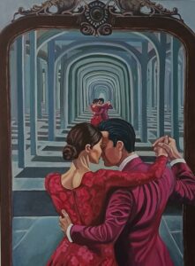 L’ abbraccio umano in relazione all’ ambiente metafisico che si perde nel labirinto.