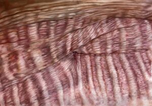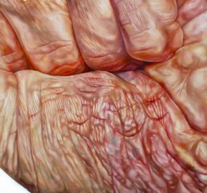 Il dipinto, parte della serie pittorica “Dismorfismi”, mostra il close-up di una pancia segnata dalle pieghe di un elastico. La
