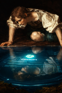 Narciso contemporaneo Un giovane si riflette non nell’acqua, ma in ChatGPT. Lo specchio naturale viene sostituito da uno specchio algoritmico.